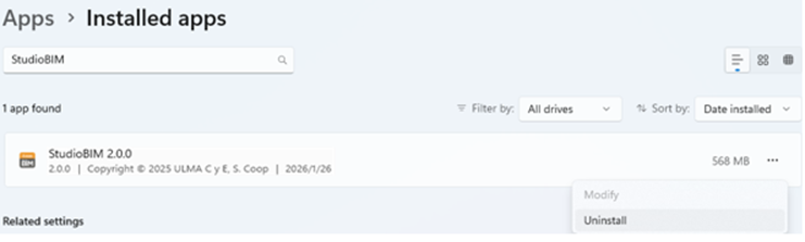To uninstall StudioBIM, go to Control Panel > Programs. A list of installed programs will be displayed. Select the program to uninstall and click 'Uninstall', then follow the instructions provided in the following dialogs.